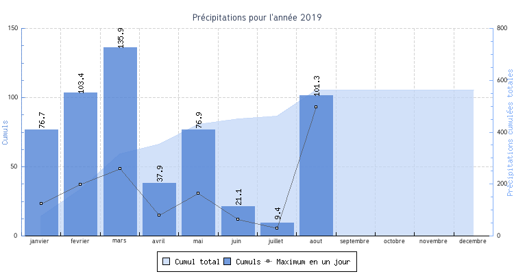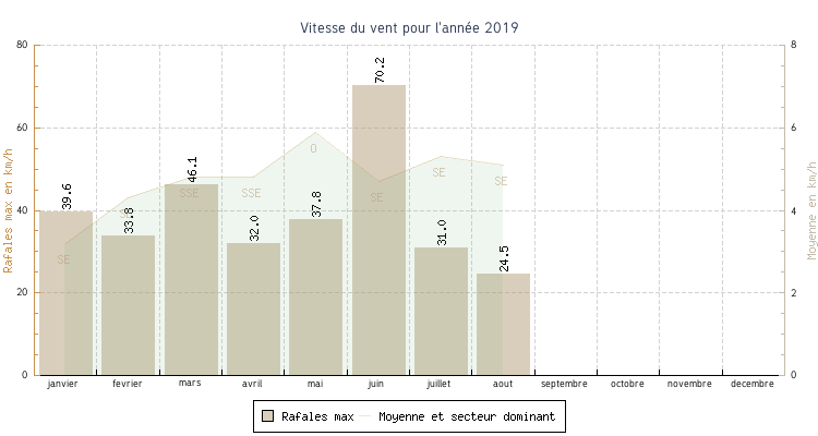 | mars | -5.4 °C | 0.1 °C | 18.8 °C | 10.8 °C | 4.5 °C | 4.8 km/h | 46.1 km/h | SSE |