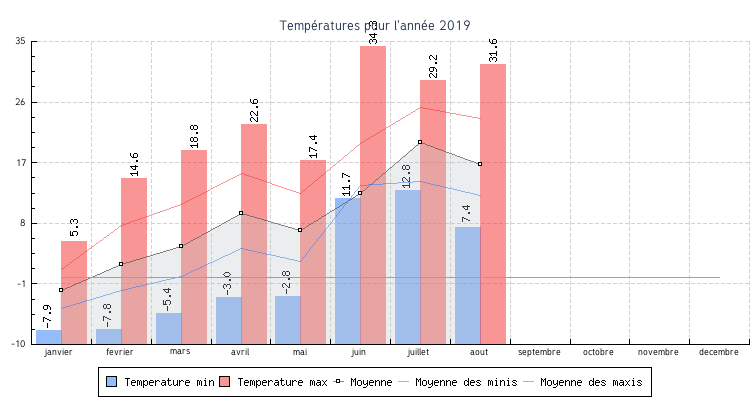 | Mois | Températures min | Températures max | Moyenne mensuelle |
