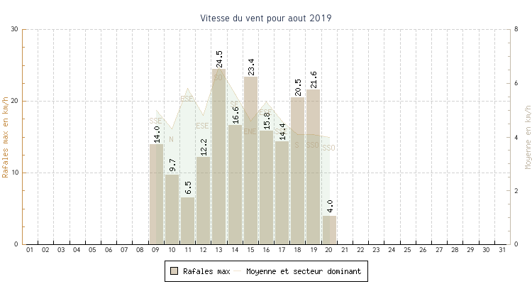 | 20 | 11.2 °C | 15.9 °C | 13.5 °C | 4.0 km/h (4.0 km/h) | SSO |